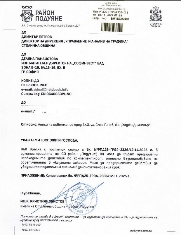 Приложено изпращаме на вниманието Ви копие на получен сигнал в районната администрация за предприемане на действия по компетентност.