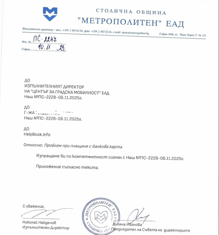 | 01.09.2025 | Неправилно таксуване от системата на Метрополитен | получил отговор | |