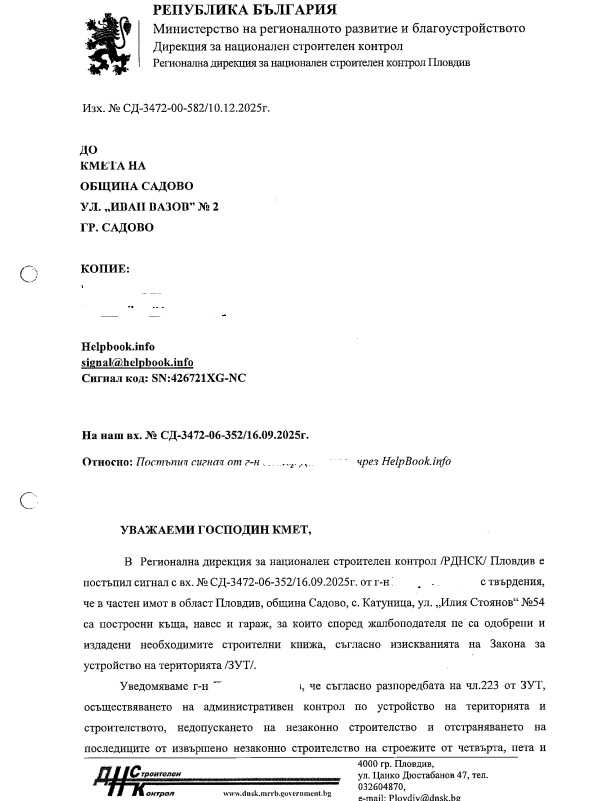 приложено Ви изпращам писмо изх.№СД-3472-00-582/10.12.2025г. на