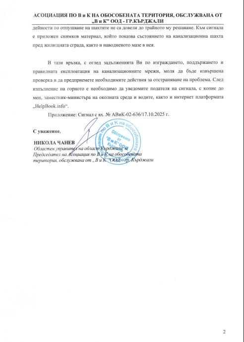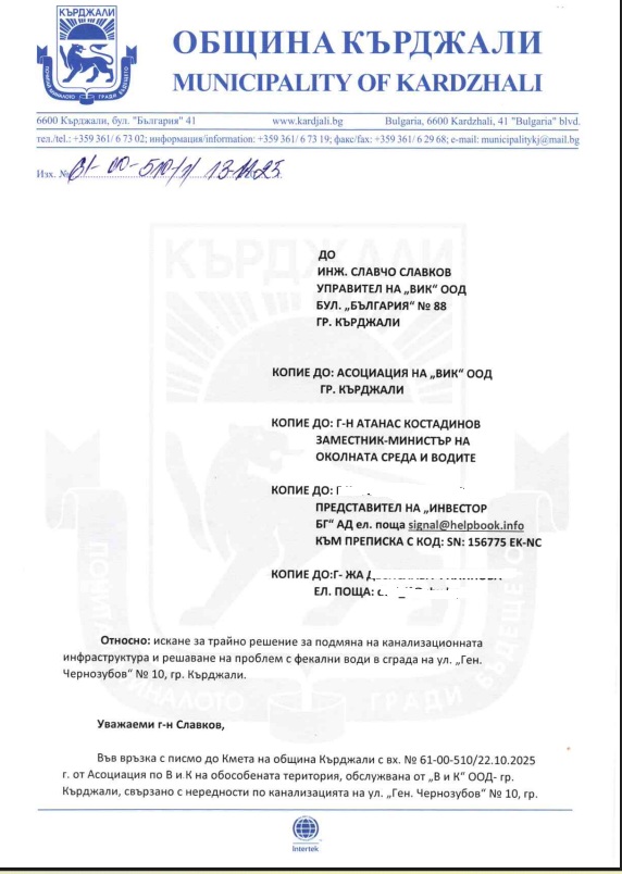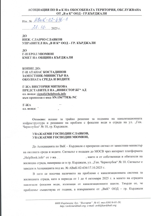 | 04.10.2025 | ОФИЦИАЛНО ИСКАНЕ ЗА НЕЗАБАВНО ОТСТРАНЯВАНЕ НА АВАРИЯ И ПРЕДПРИЕМАНЕ НА ТРАЙНО РЕШЕНИЕ НА ПРОБЛЕМА С ФЕКАЛНИ ВОДИ | получил отговор | |