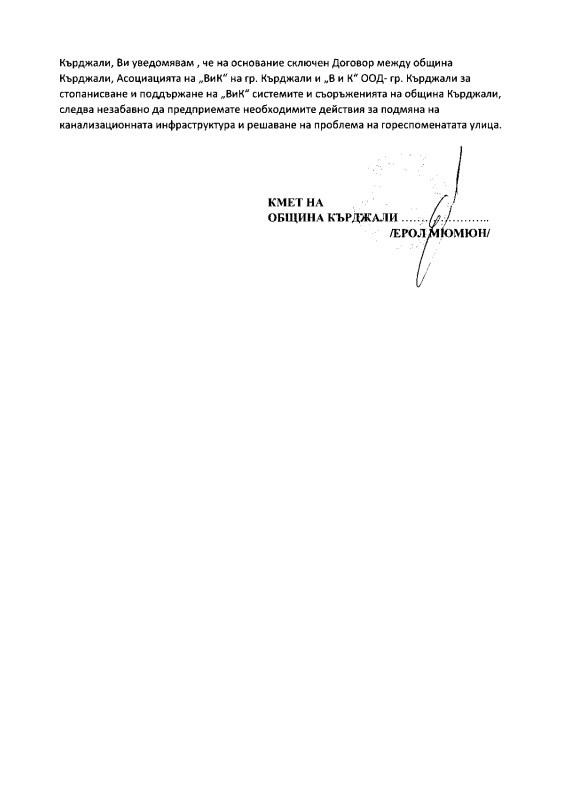 -- Савина Ангелова Старши експерт Отдел ЦАО Дирекция АО МОСВИскане за трайно решение за подмяна на канализационната структура и решаване на проблем с фекални води в сграда на ул. Ген. Чернозубов 10, гр. Кърджали