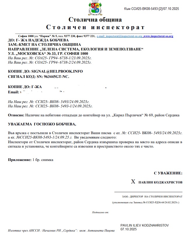 Писмо с номер Към ССИ25-ВК08-4352-[1]/11.08.2025 10:37:18 относно "Онговор на сигнал: Зареждане на контейнер на ул. „Бeрезина“ № 10, на ъгъла с ул. „Калач“, район Сердика" е прикачено към този E-mail.