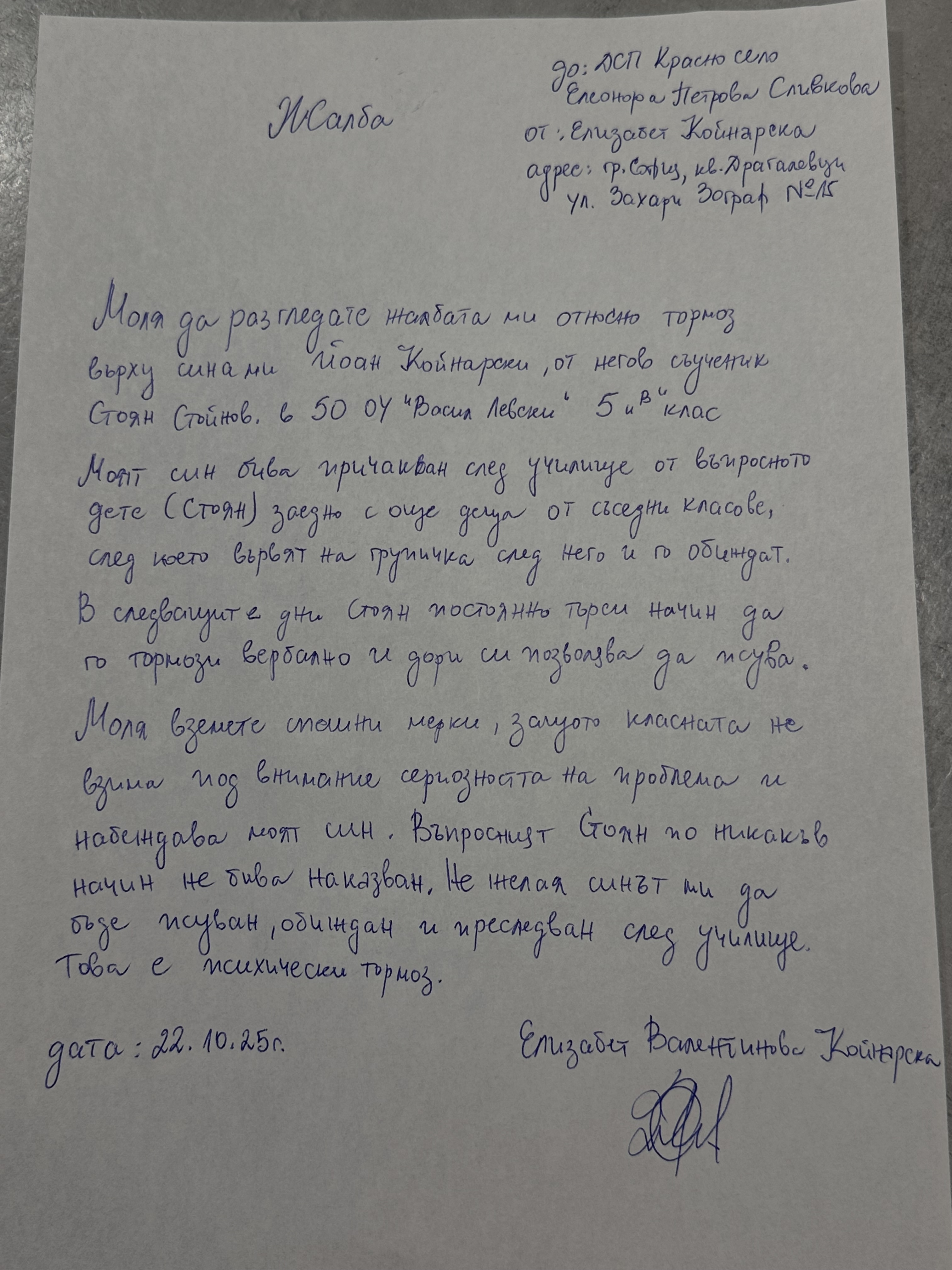 твърдения за тормоз спрямо сина й *** от страна на неговия съученик