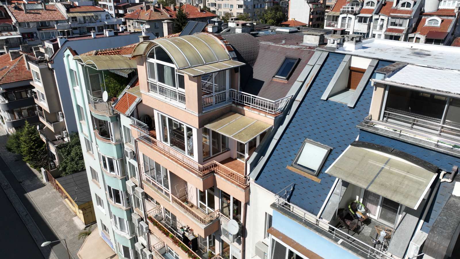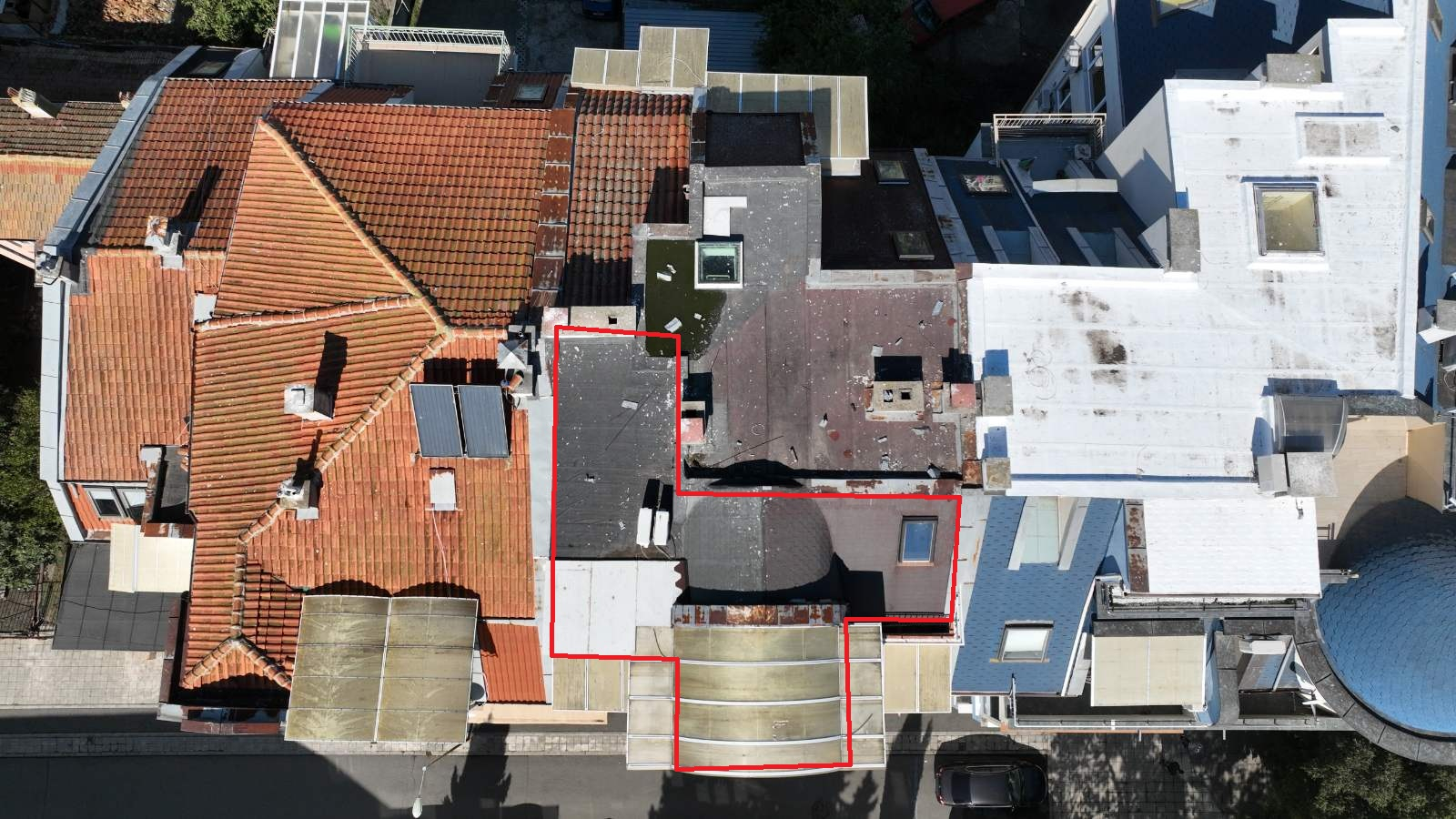 Въпросният имот е обект на незаконна надстройка и заграбване на общи части (маркирани в червено на приложената снимка), включително: