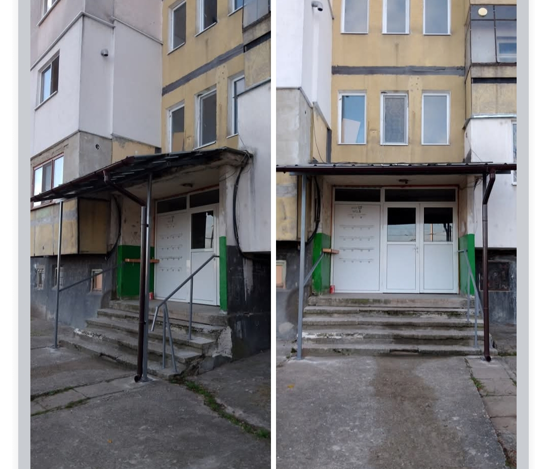 Подавам сигнал за незаконно изградена конструкция (навес от ламарина с улуци и метална носеща конструкция), излизаща приблизително два метра пред входа на жилищна сграда в гр. Враца, ул. …, бл. …, вх. … (виж прикачени снимки).