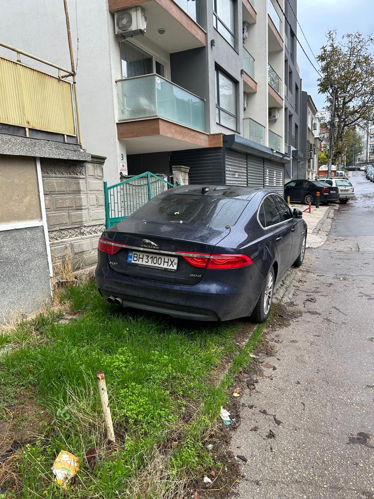 на адрес гр.Варна, ул.Жеравна №1, на тротуара пред гаражната порта за влизане в гаража паркиран автомобил марка Ягуар, цвят тъмносин номер UA ВН3100НХ. Автомобилът е паркиран там вече над 24 часа като ми прече да ползвам имота си нито да се минава по тротуара! Моля да се предприемат необходимите мерки за въздействие на нарушителя.