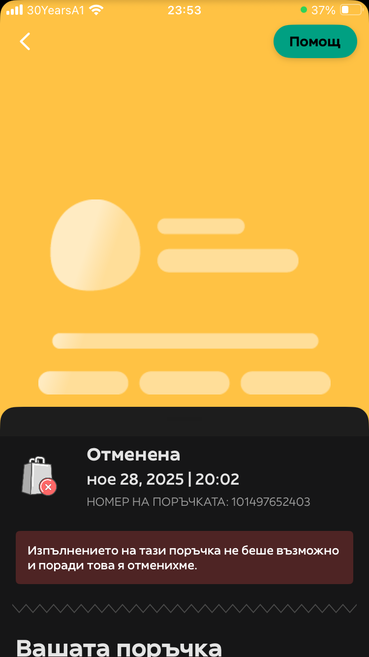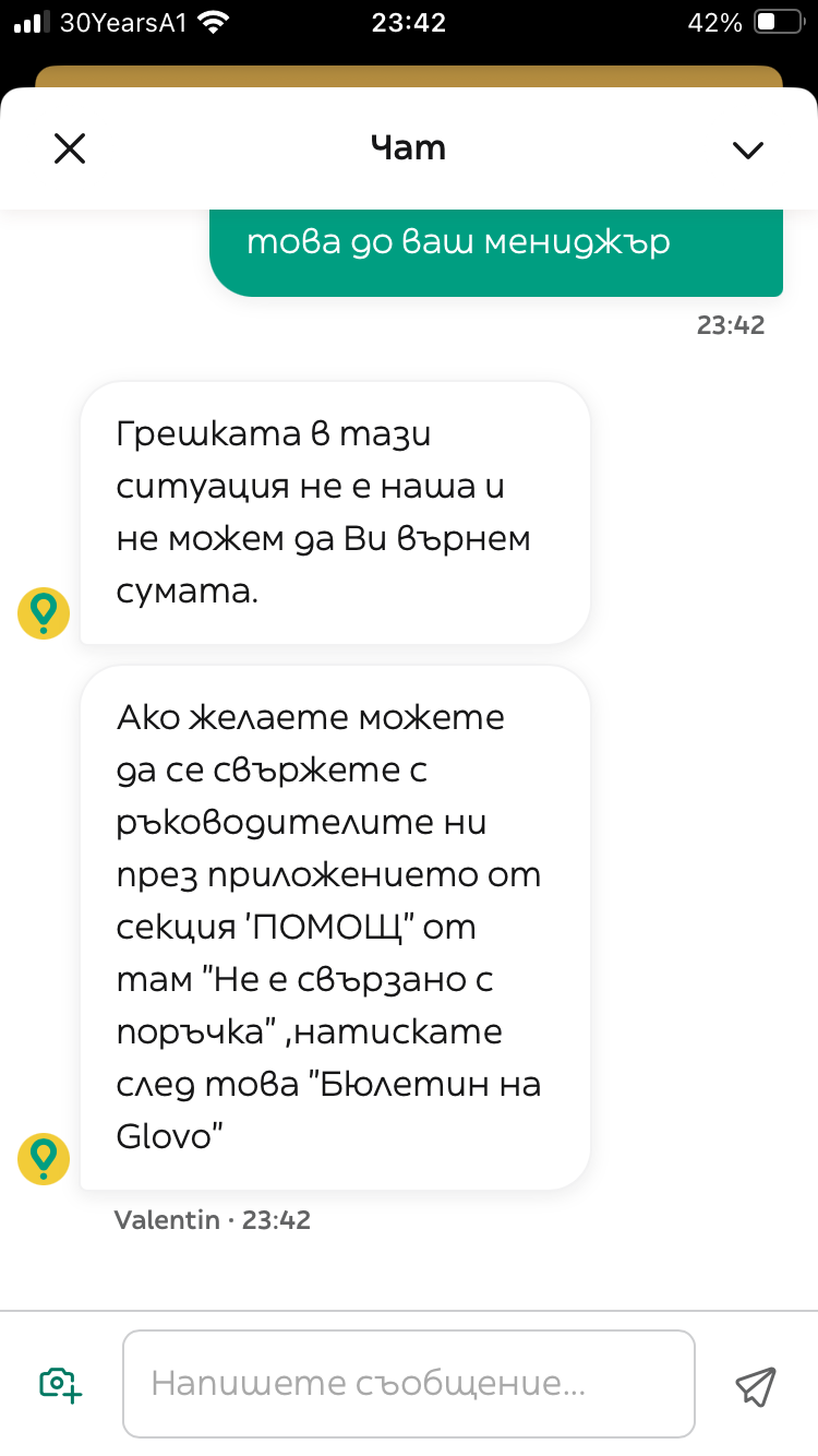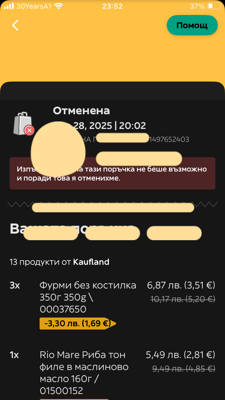на 28.11.2025 към 18.30 направих поръчка #101497652403 към търговец Glovo през мобилното им приложение на стойност 94.62лв, заплатени предварително с банкова карта. В коментар изрично посочих, че бих искала поръчката да се достави утре (т.е. 29.11.2025) в часове между 9 и 10 сутринта и получих потвърждение, че "Коментарът е предаден на куриера". След това потвърждение същата вечер излязох навън и за съжаление бях забравила мобилния си телефон. Имах няколко пропуснати повиквания от стационарен номер (може би Glovo, не знам, понеже когато се опитах да върна обажданията телефонът не беше включен). В приложението видях, че поръчката ми е със статус "Отменена". Свързах се веднага със support на приложението където отказаха да ми съдействат и казаха, че тъй като не е могло да се достави поръчката същата вечер, ми се удържа цялата сума на поръчката (94.62 лв + ПЛЮС доставка) като тип глоба. На въпроса за какво ме глобяват при положение, че ясно съм посочила кога искам да бъде доставена поръчката ми се обясни, че това не било коректен начин да се насрочи поръчката за друг ден, но отказаха да ми обяснят защо ако съм получила уверение, че коментарът е предаден на куриера това е некоректно от моя страна. Не успяха да дадат обяснение, само държаха колко са прави и че ме глобяват стойността на цялата поръчка. Това е изключително некоректна практика да не говорим, че сумата на "глобата" е страшно висока. Държа да отбележа, че отделно на това: