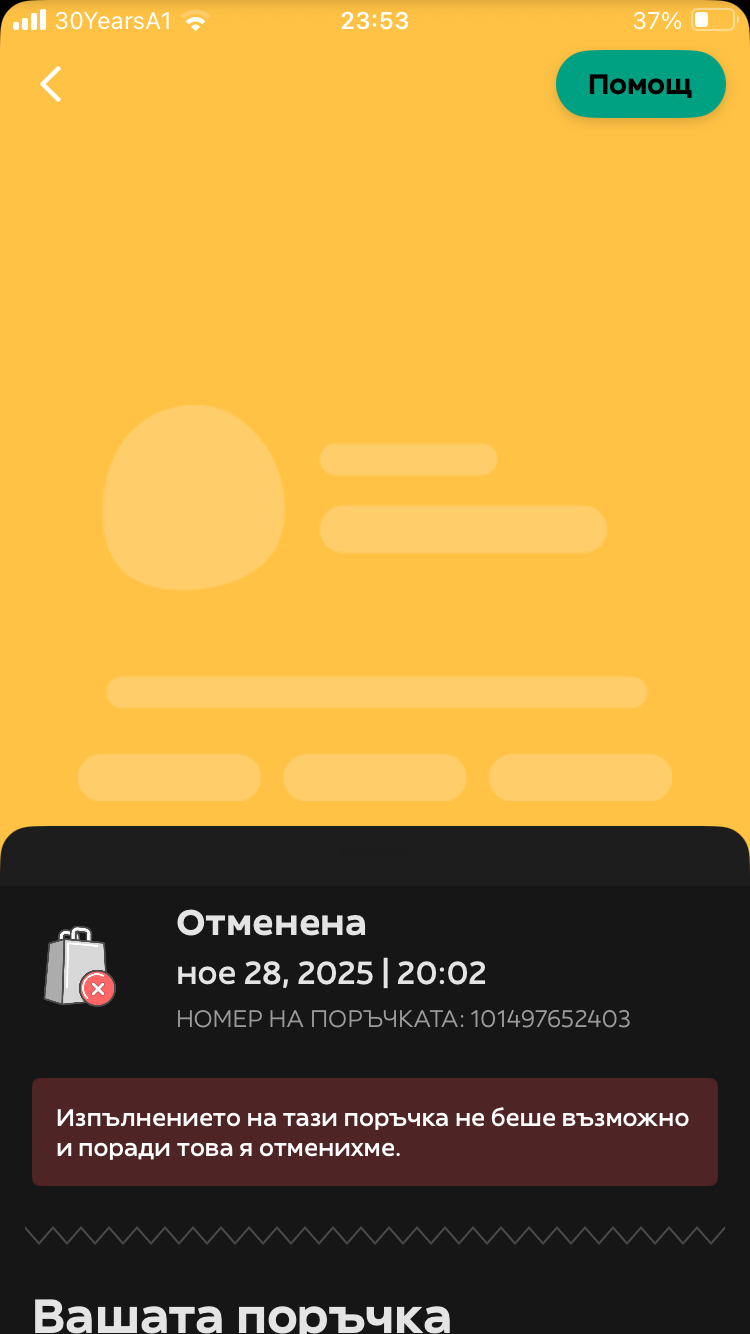 2. на 26.11.2025 направих онлайн поръчка #101495976698 към Glovo на стойност 33.33 лв, която след може би час и половина чакане беше отменена ЕДНОСТРАННО ОТ GLOVO без никакви обяснение, обаждане или каквото и да било. Сумата, която бях платила просто беше възстановена БЕЗ НИКАКВА КОМПЕНСАЦИЯ.
